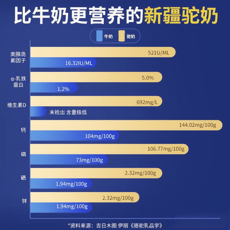 推荐理由:华夏丝路骆驼奶粉的神奇之处在于,每100克驼奶中含有高达1130毫克的钙,比牛奶中的钙含量高出10倍!而且,驼奶的蛋白质含量有29.0克,比牛奶高出48%,真是高蛋白好吸收。此外,驼奶中的乳铁蛋白和免疫球蛋白含量也非常可观,这些都是对身体极为有益的成分。驼奶的低GI、低GL、低嘌呤特性,适合各种体质的人群饮用。
